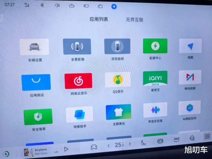 这里需要说一下,一体式天际屏尺寸较大,可以同屏显示,也支持分屏模式,例如左侧看电视,右侧听音乐,同时配合前排和二排座椅提供的头枕音响,也不会互相打扰。此外,该屏幕也支持多屏同看,影视内容可设定播放屏幕,例如将内容投射到二排的30寸吸顶屏,或者是利用车外灯光投影播放。